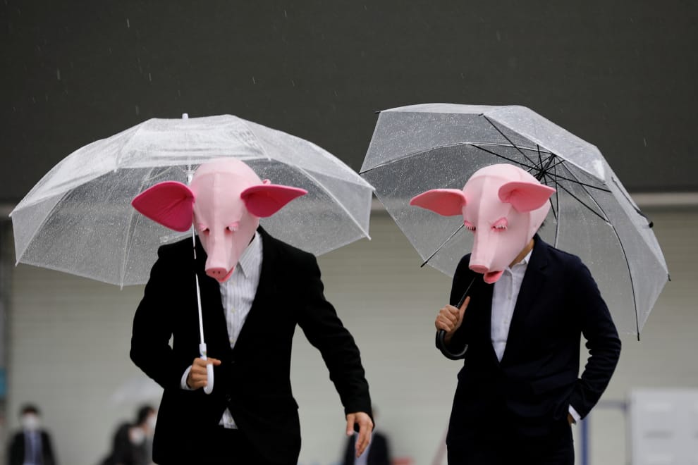 在受到COVID-19(武漢肺炎)疫情影響、空蕩蕩的東京街頭,兩名戴著豬頭面具的YouTuber正在拍片。