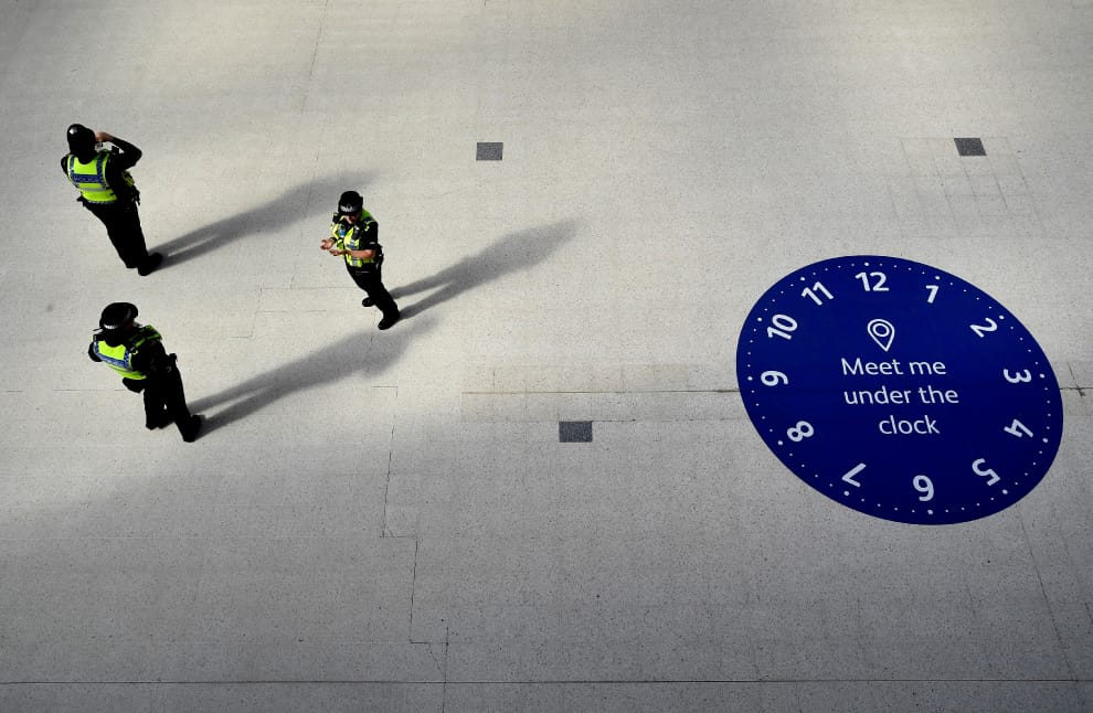 在倫敦滑鐵盧車站(Waterloo station),警察們站在寫有「和我在鐘下相見」字樣的地板圖示旁。