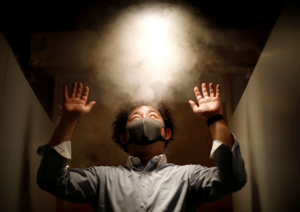 在東京都新宿區的一間居酒屋,一名客人在入內前先被噴灑消毒噴霧。