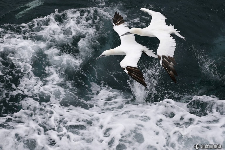 兩隻北方塘鵝( Morus Bassanus)飛過天空,下方一艘漁船剛好開過帶起了許多白色泡沫