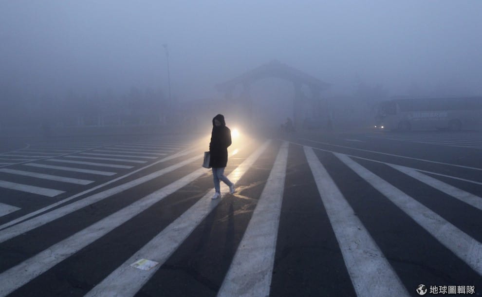 中國吉林連日來受到嚴重的霧霾汙染,民眾走過一片白茫茫的街區