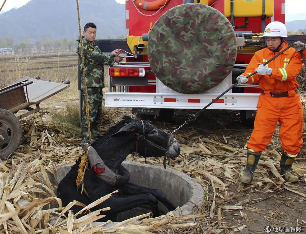 消防員正用力把一隻掉進井裡的驢子拉出來。當地正值豐收期前,農人趕著採收卻讓驢子就這麼掉進井中
