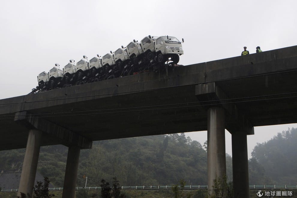 中國貴州省一輛拖曳車差點掉到橋下,所幸無人傷亡