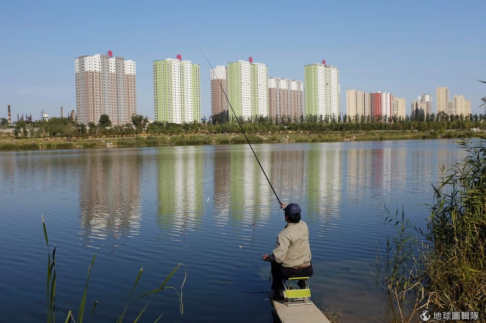 一名男子坐在靠近北京住宅區的湖畔釣魚,中國近日的房價再度創下新高,房價攀升了9.1%