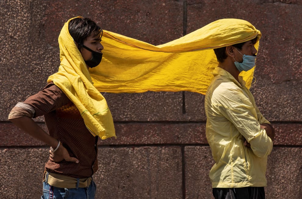 在新德里,兩名移工共用一條圍巾遮陽,他們正在排隊準備登上回老家比哈爾邦(Bihar)的火車。