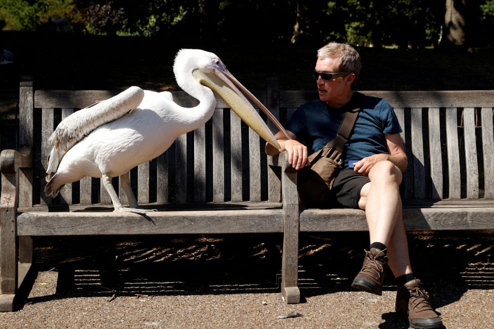 在倫敦的聖詹姆士公園內,一隻鵜鶘站在長椅上看著坐在一旁的男子。