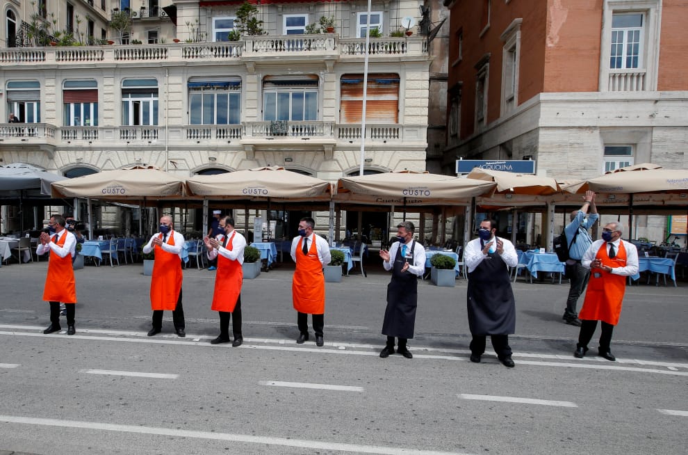 在義大利南部第一大城拿坡里,餐廳員工們在重新營業前齊聚一堂,用掌聲感謝醫護的辛勞。