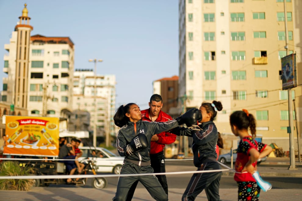 在加薩市,因為疫情的關係拳擊場暫時關閉,拳擊教練阿約布(Osama Ayob)乾脆帶著學生到海灘的人行道旁練習。