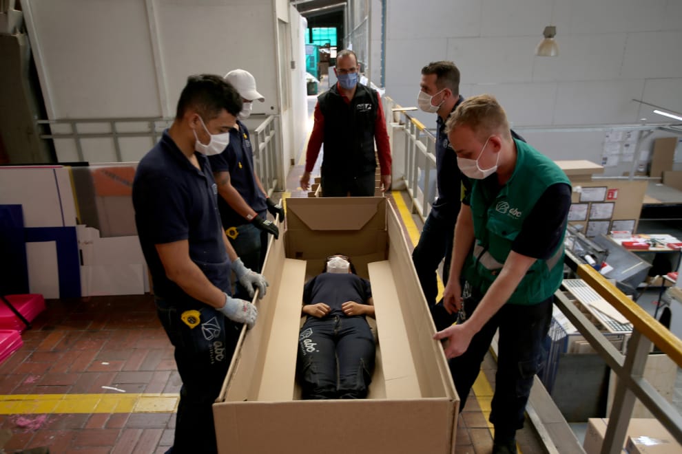 在首都波哥大,ABC Display公司的員工正在示範怎麼把他們用紙板製作的醫院病床一秒變棺材,好應付感染COVID-19(武漢肺炎)不幸身亡的患者。