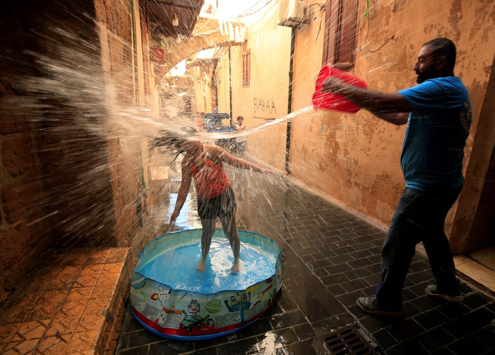 在位於地中海沿岸的賽達市(Sidon),一名男子在家庭用泳池朝小女孩潑水,一解炎熱難耐的暑意。
