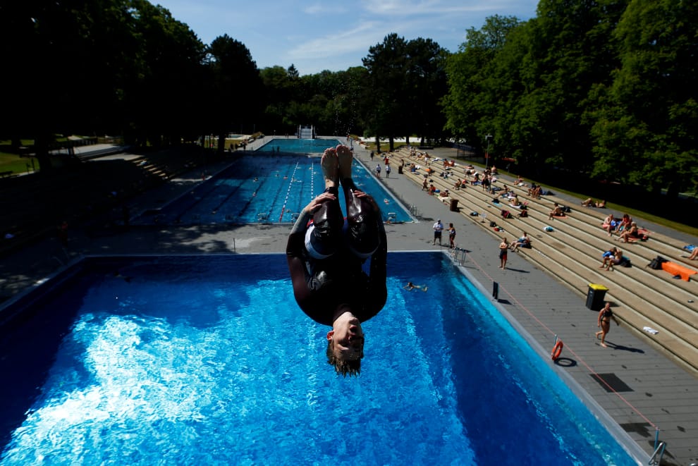 在科隆一處重新營業的露天泳池,泳客開心地享受沁涼的池水。