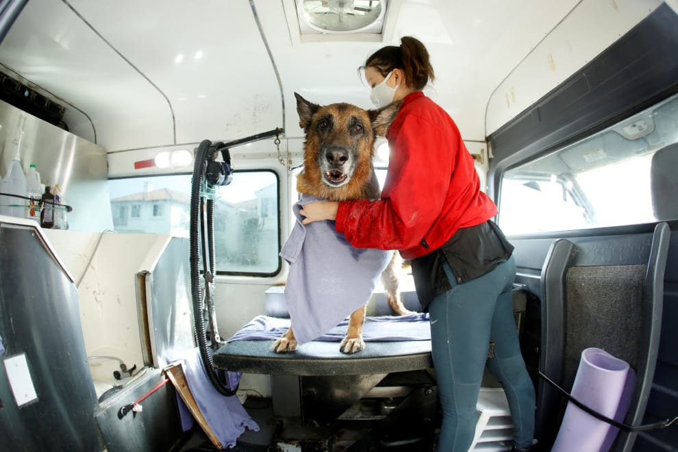 隨著加州開始放鬆隔離限制,部分被列為「非必需」的服務人員也開始重返工作崗位,狗狗美容師卡爾森(Vanessa Carlson)就開著他的行動洗狗車來幫德國牧羊犬阿格尼(Agni)服務。