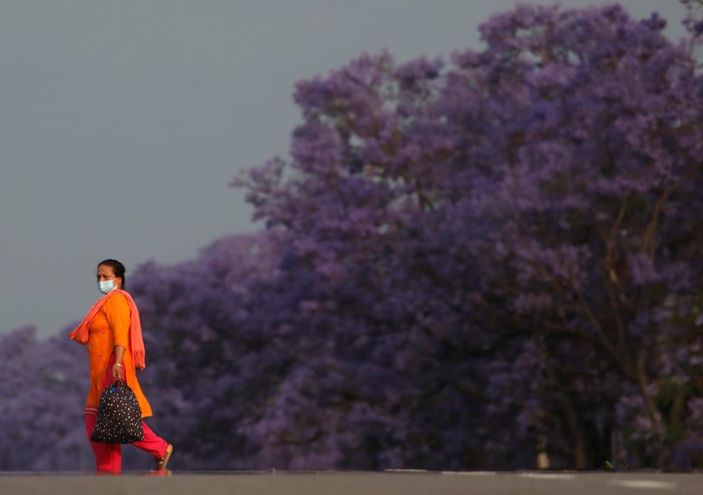 在位於尼泊爾中部的拉利特普爾(Lalitpur),一名戴著口罩的女子走過盛開的藍花楹。