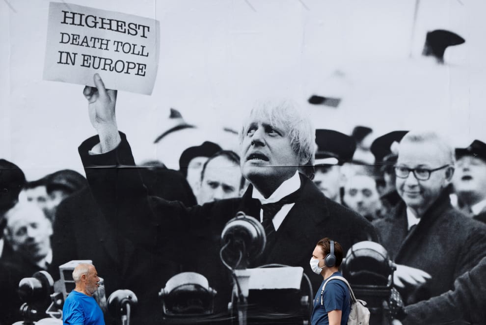 在倫敦街頭,人們走過一幅英國首相強生(Boris Johnson)手拿寫有「歐洲致死人數最高」字樣海報的廣告。這幅廣告旨在控訴英國政府防疫不力,讓英國致死人數成了歐洲第一。