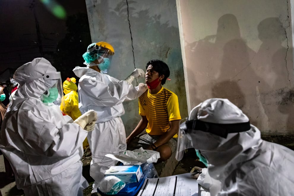 在中爪哇省首府三寶瓏市(Semarang),醫護人員正在對市場攤販進行採樣,準備做COVID-19(武漢肺炎)的檢測。