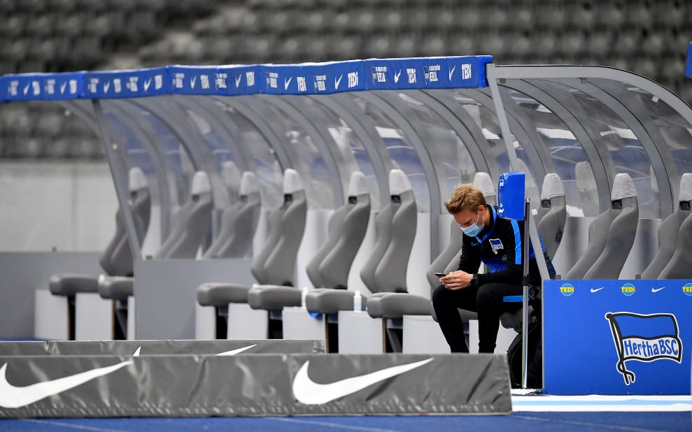 在柏林的足球場內,一名戴著口罩的球員在閉門球賽開踢前坐在球員休息區滑手機。