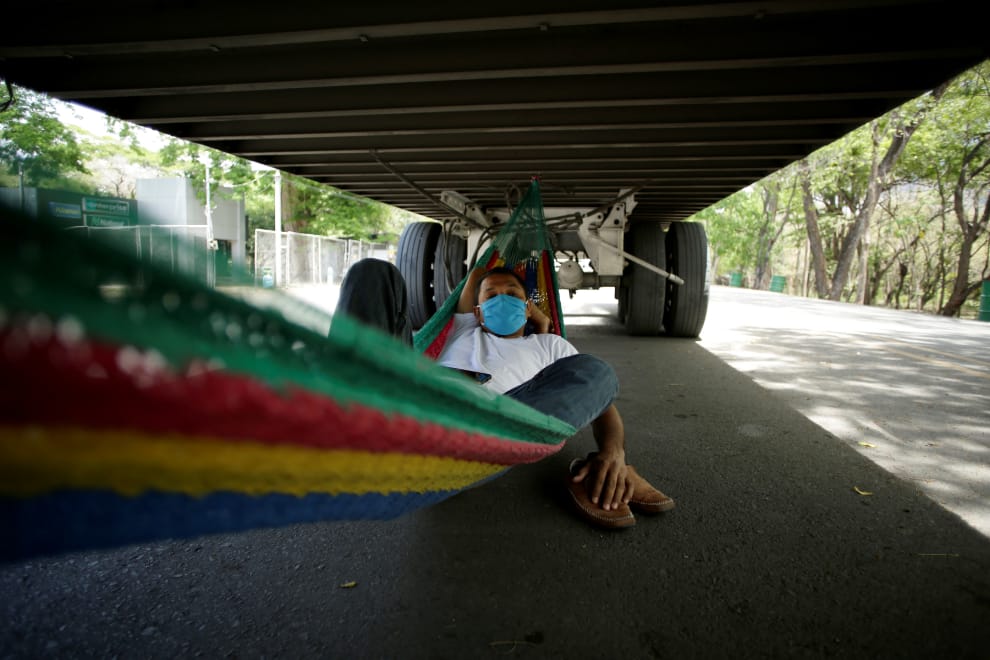在尼加拉瓜政府關閉與哥斯大黎加的貨運交通邊界後,一名哥斯大黎加的貨車司機索性拿出吊床,掛在貨車底下小睡片刻,等待邊界重新開放。