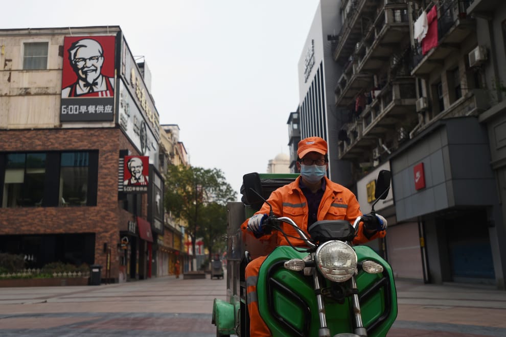 歐新社 / 達志影像圖為武漢當地一名清潔工,騎著摩托車經過大街上。