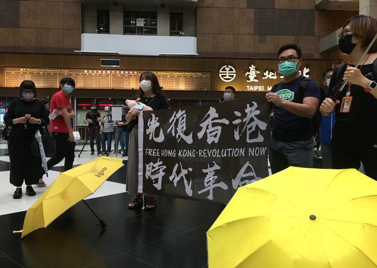 在台北車站大廳,手持「光復香港  時代革命」字樣的民眾用行動支持香港親民主人士抗議港版《國安法》。