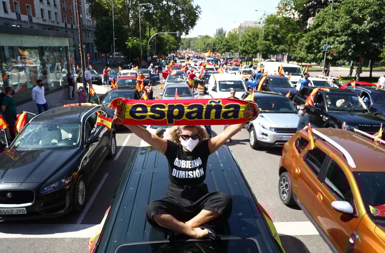 在馬德里街頭,西班牙極右翼政黨「聲音黨」(VOX)的支持者手拿國旗、開車上街抗議政府防疫不力。