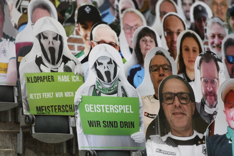 在德國西部的門興格拉德巴赫市(Moenchengladbach),足球場的觀眾席上出現了球迷和死神的紙板假人,共同為閉門球賽加油。