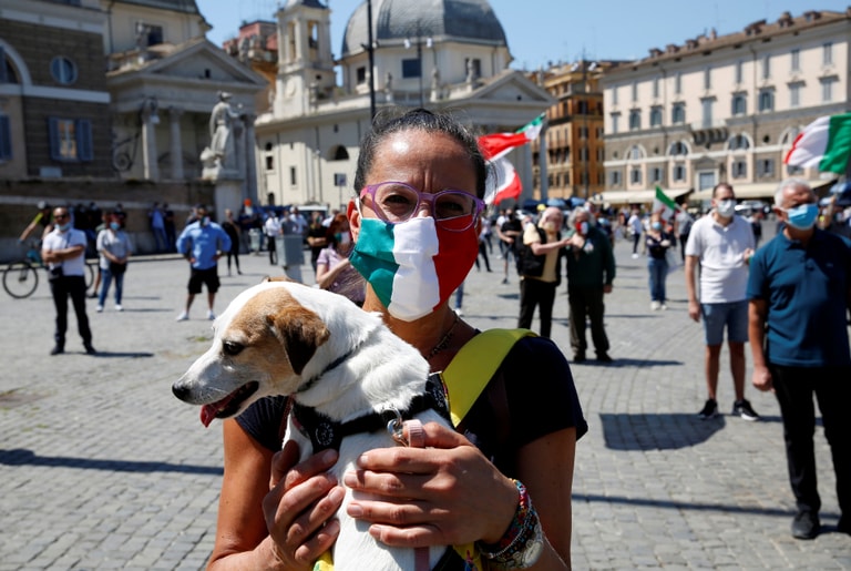 在羅馬街頭,參加「三色口罩」(Mascherine Tricolore)運動的民眾戴上義大利綠、白、紅國旗色的口罩,抗議政府在疫情期間採取的經濟措施。