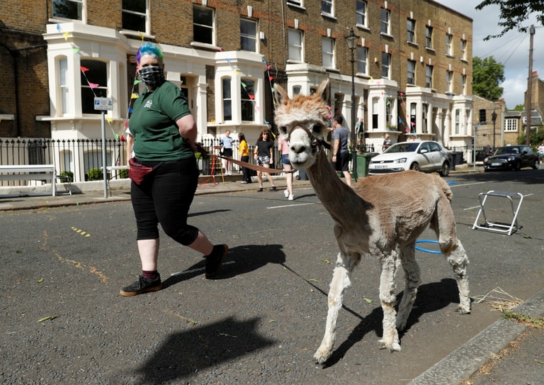 在倫敦肯寧頓區(Kennington),健身房的工作人員牽著一隻羊駝逛大街,活絡整個社區的氣氛。