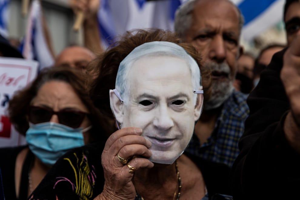 在以色列總理府外,支持以色列總理納坦雅虎(Benjamin Netanyahu)的民眾戴著他的人臉面具前來聲援出庭受審的他。納坦雅虎遭控詐欺、背信和賄賂,利用權勢替企業家搭橋,好交換昂貴的雪茄和香檳以及對媒體的控制權。