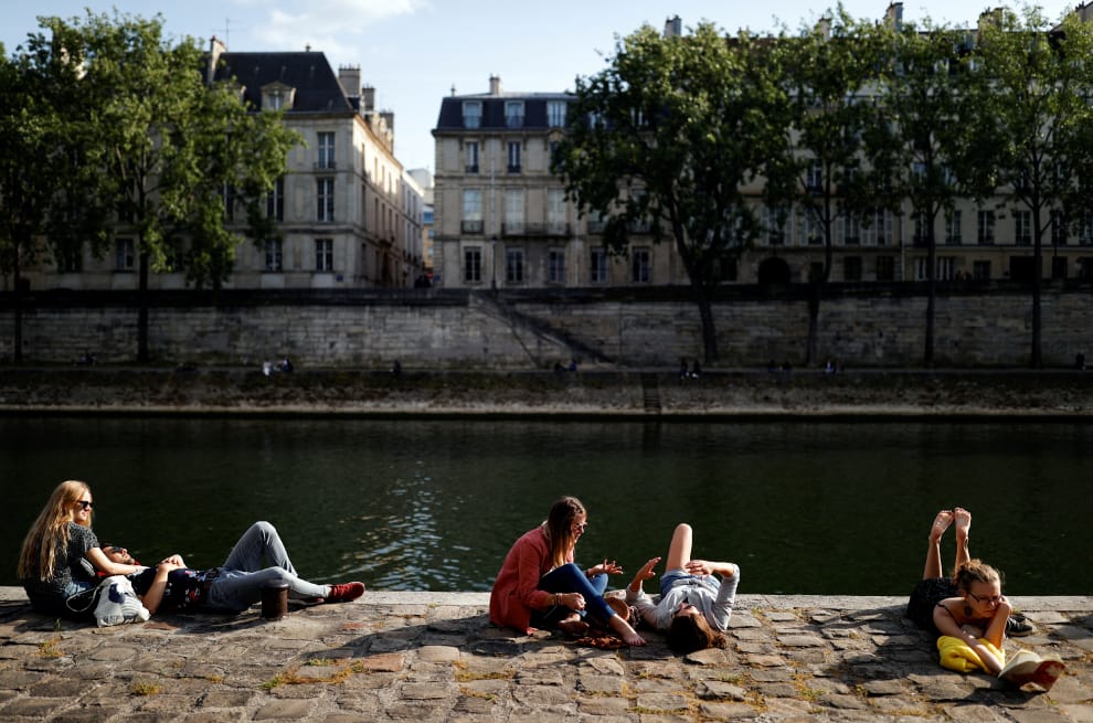 在巴黎塞納河畔(Seine River),人們一邊曬太陽一邊談天和看書。