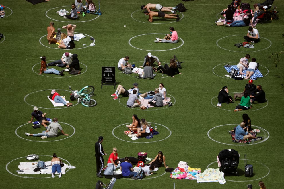 在紐約市布魯克林區,人們在多米諾公園(Domino Park)劃定的社交安全距離圈圈中享受陽光。