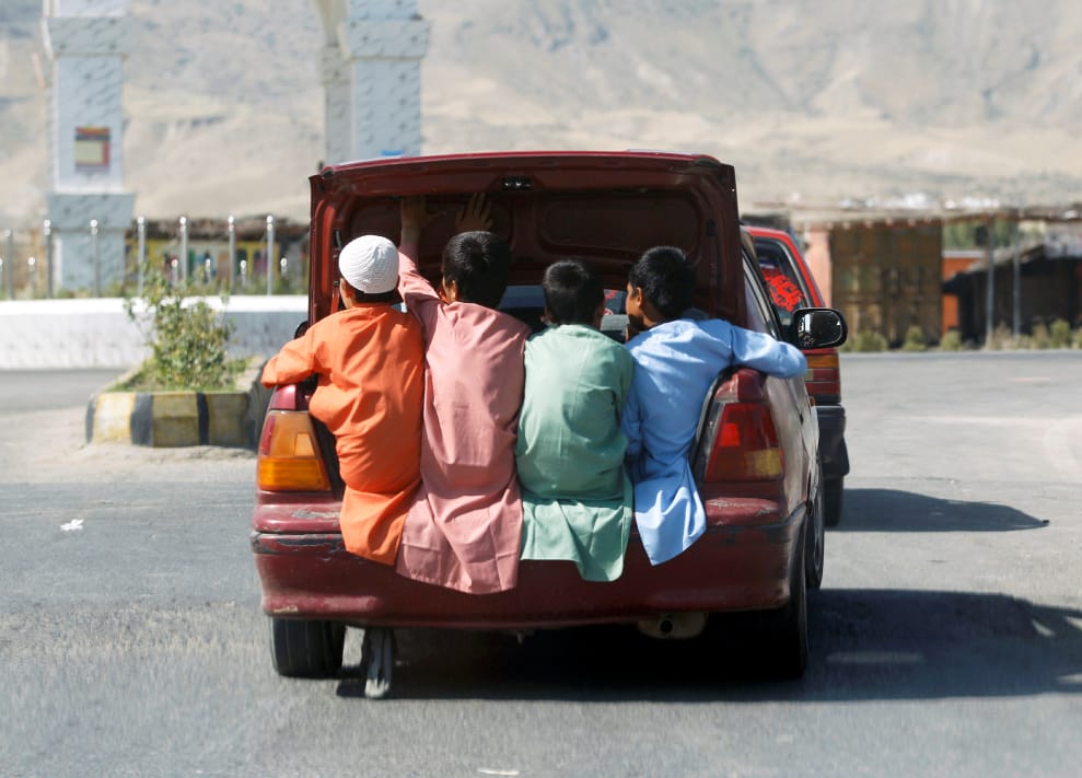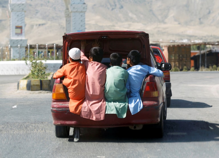 在阿富汗中部偏東的拉格曼省(Laghman province),四名小男孩在開齋節期間坐在後車廂移動。