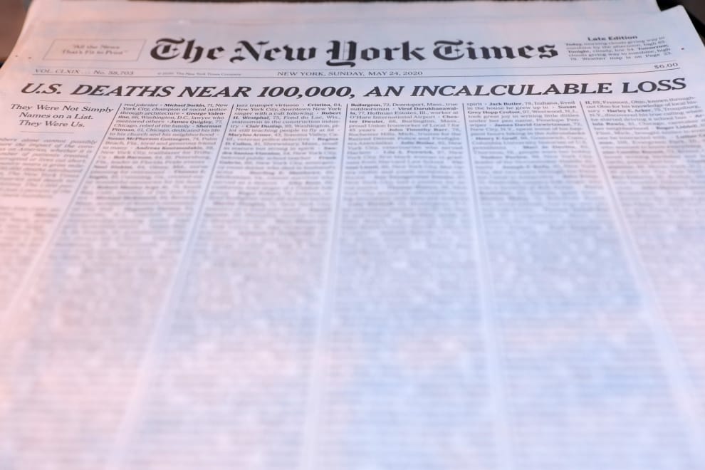 24號這天,《紐約時報》頭版放上了千名感染COVID-19(武漢肺炎)死亡者的姓名和用來形容他們的一句話,像是愛看小說、最有鬼點子的奶奶等等,讓每一個死者的形象躍然紙上,在哀悼他們離世的同時,也點出美國死亡人數逼近 10萬的現況。