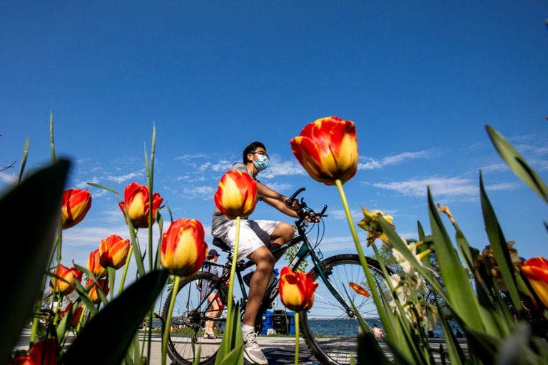 在安大略省首府多倫多市,民眾戴著口罩伴著盛開的鬱金香在海灣公園騎腳踏車。