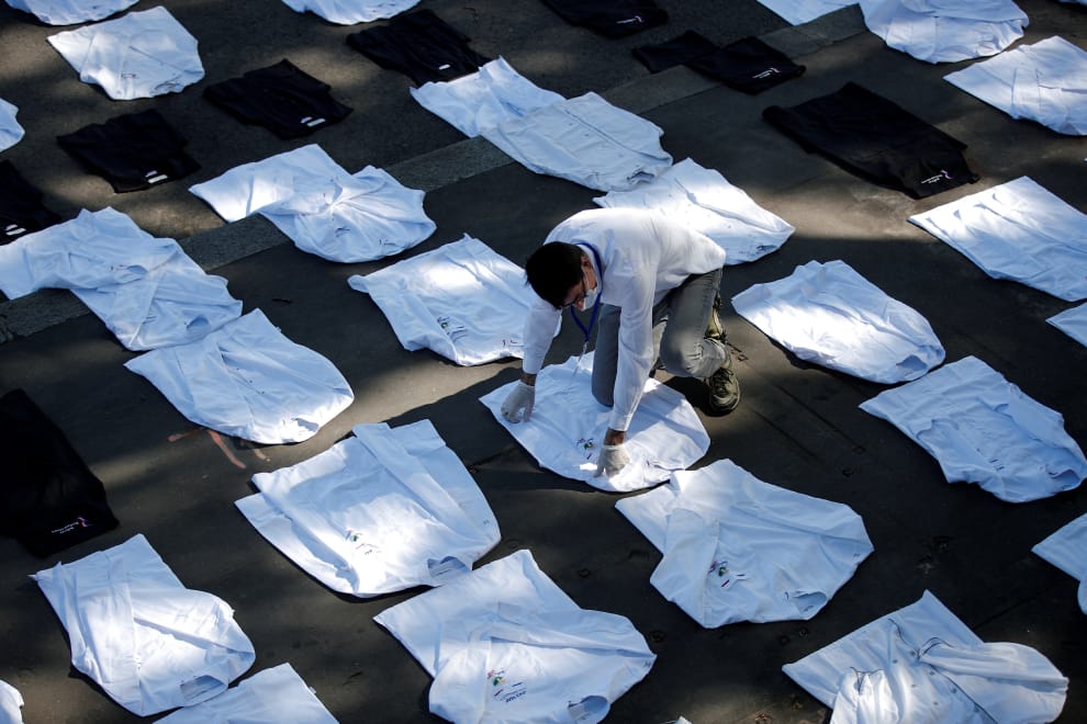 在巴黎塞納河畔,可以看到廚師服、廚師帽和餐廳托盤被整齊地擺在地上,巴黎餐飲業者想藉此呼籲法國政府盡快讓餐飲業者能重新營業,減少因為COVID-19(武漢肺炎)造成的經濟損失。