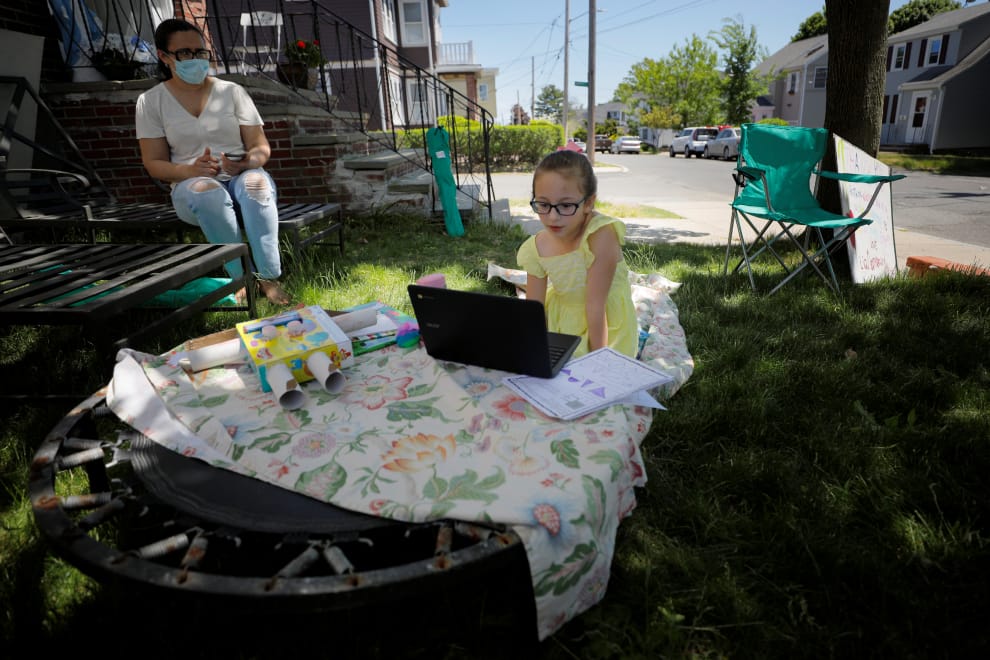 在麻州的艾弗雷特市(Everett),今年 7歲的塞普(Lia Maria Sepe)和媽媽在前院遠距學習。