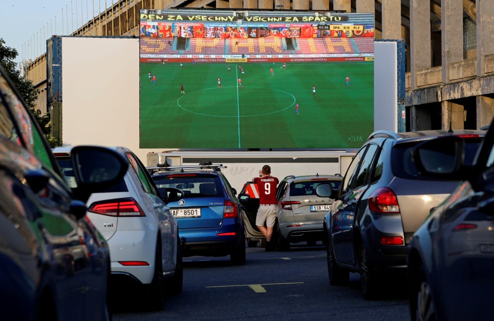 在布拉格,人們開著車來到專門轉播足球比賽的「得來速」電影院,好好欣賞暫停兩個月後重啟的足球賽事。