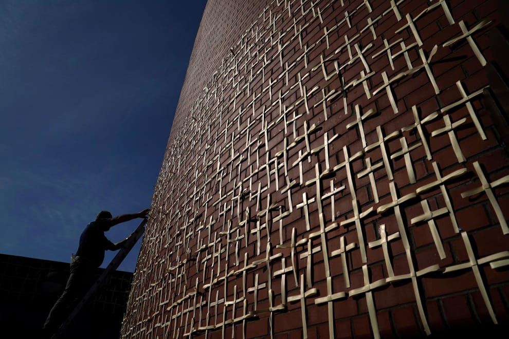 在首都都柏林的一座教堂外,工作人員將一具具十字架固定在牆面上,這裡的每一具十字架都代表一名愛爾蘭感染COVID-19(武漢肺炎)身亡的死者。