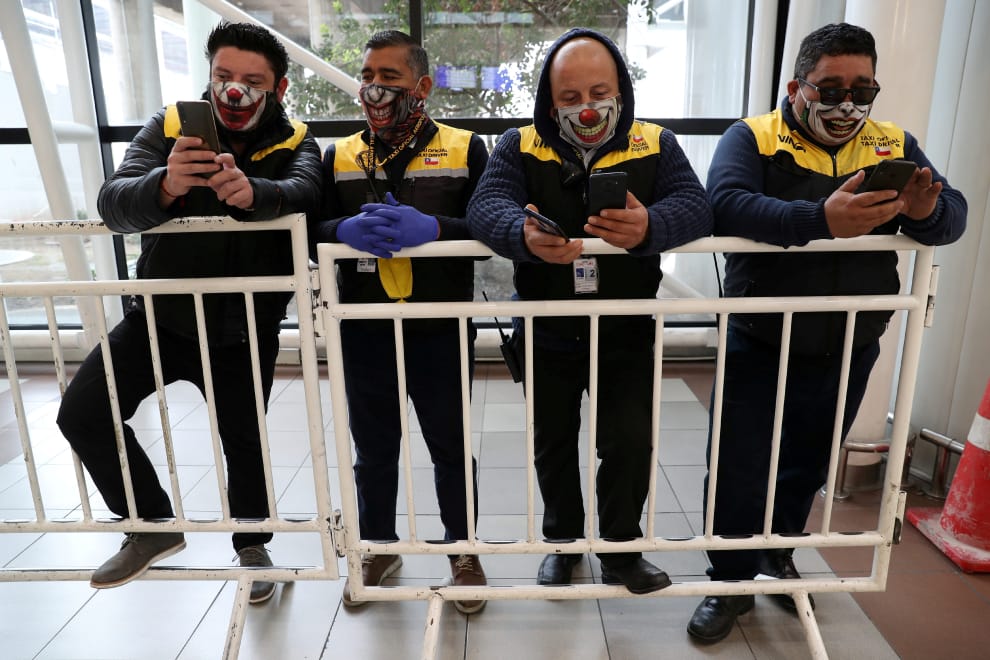 在聖地牙哥國際機場的國內線等待區,戴著口罩的計程車司機一邊用手機,一邊等待客人上門。