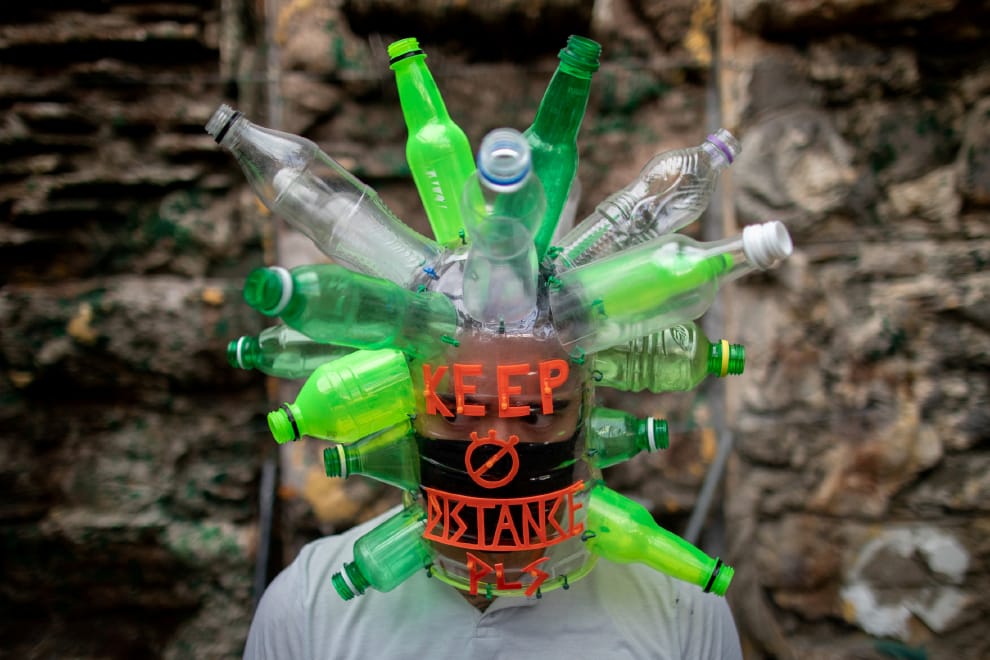 在菲律賓人口第一大城奎松市(Quezon City),菲律賓藝術家紐爾(Leeroy New)戴上自製的防疫面具,上頭寫著「保持距離,拜託」。