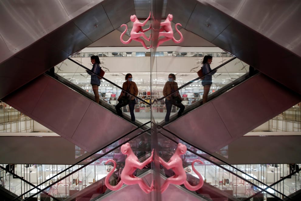 在巴黎春天百貨,顧客們戴著口罩逛街,享受當局放鬆封鎖措施後帶來的那抹悠閒。