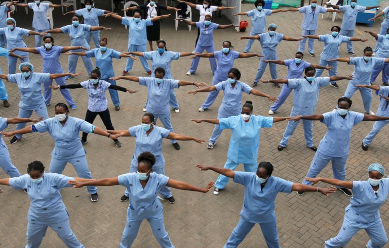 在肯亞最大也最古老的肯尼亞國立醫院(Kenyatta National Hospital),護理人員戴著口罩參加Zumba有氧課程。