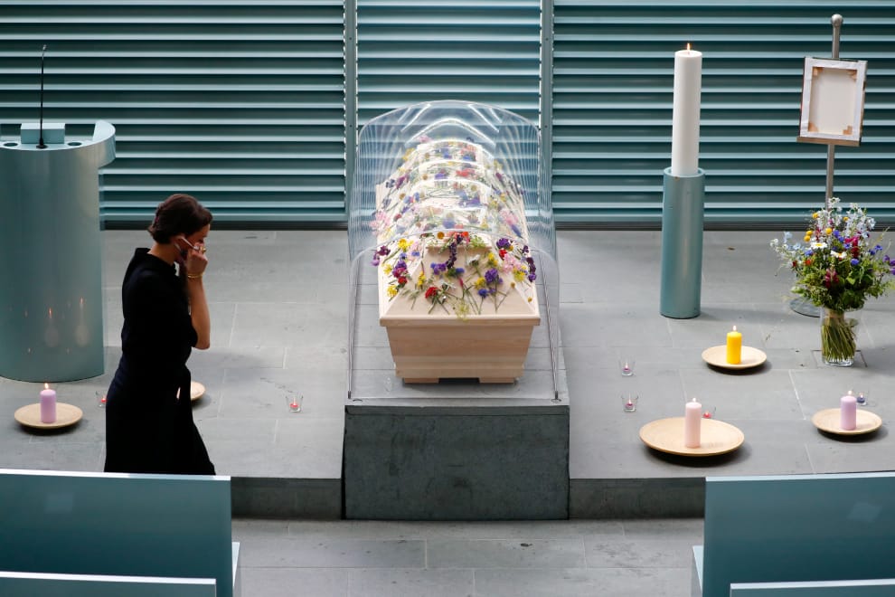 在柏林,一具棺材被罩在塑膠罩下,這是為了衛生事先採取的防護措施。