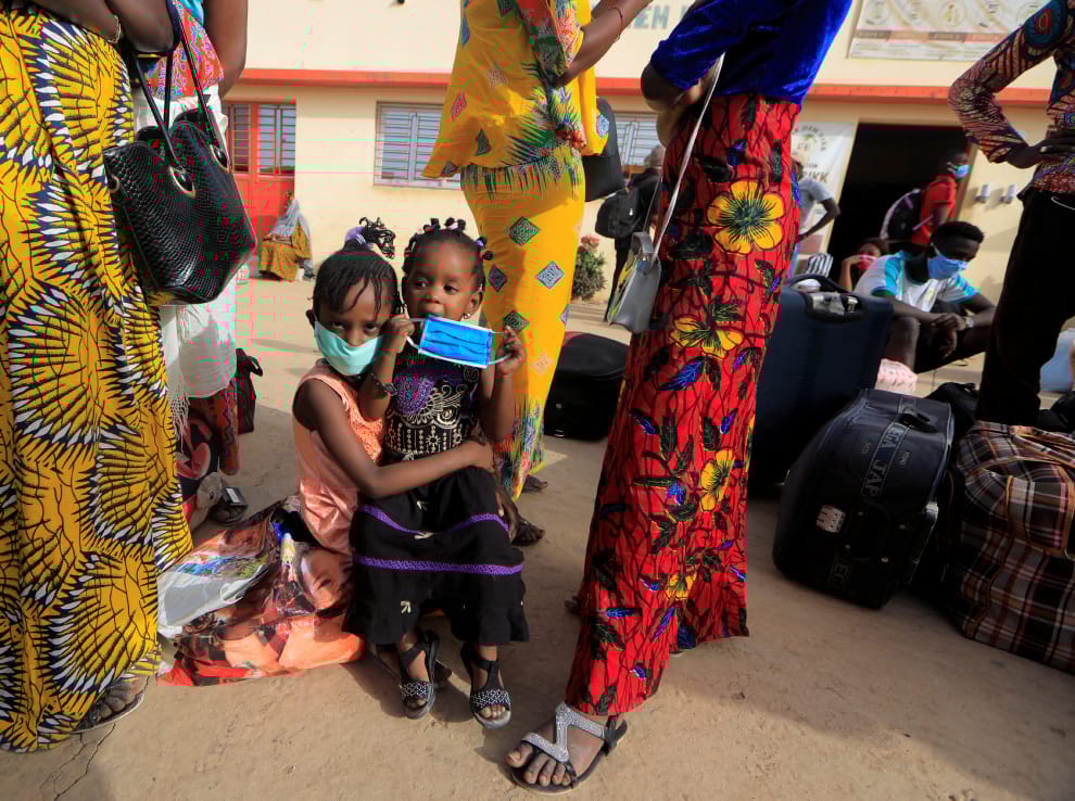 在首都達碦爾(Dakar),鄉村學校的老師們和他們的孩子等著搭上政府派出的公車,重返先前工作的學校,為下周的復學做準備。
