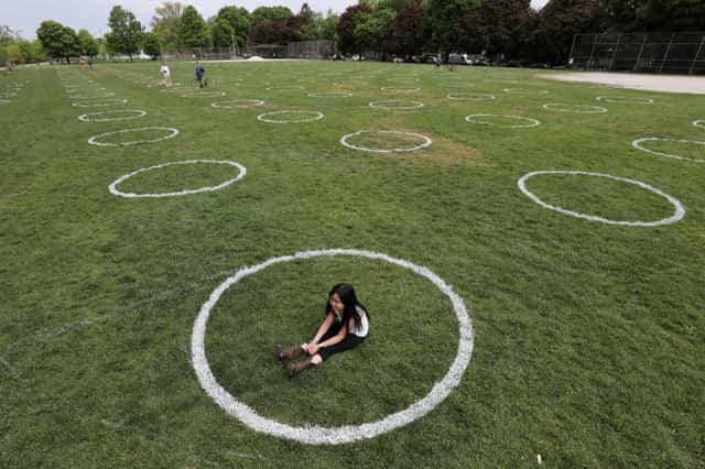 在多倫多市的聖三一貝爾伍德公園 (Trinity Bellwoods Park),一名小女孩坐在草地上的白色圈圈中,這個圓圈是用來提醒人們在草地享受陽光之餘,也要保持社交距離。