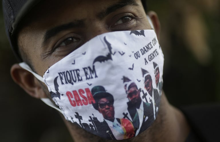 在里約熱內盧發放疫情緊急救援金的銀行外頭,一名男子戴著印有迦納抬棺手圖案的口罩,上頭寫著「待在家,要不就跟我們一起跳舞」的字樣。