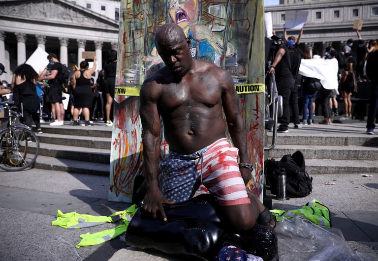在紐約市,抗議黑人佛洛伊德(George Floyd)遭白人警察用膝蓋壓頸致死的民眾,拿起塑膠人偶重現了當時的場景。