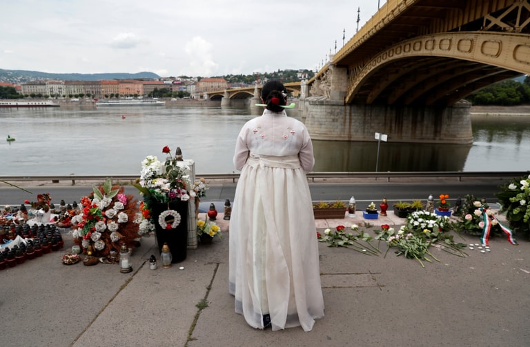 在去年發生「人魚號」(Mermaid)觀光船沉默事件的布達佩斯多瑙河,一名身穿傳統韓服的女子正在瑪格麗特橋旁悼念。