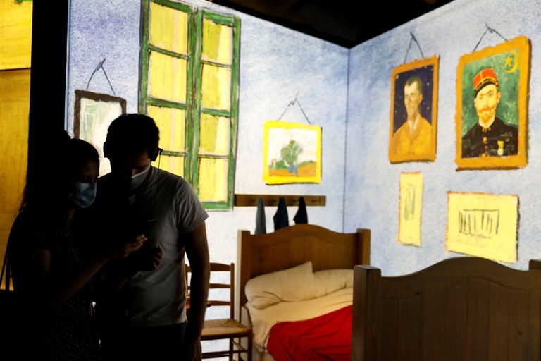 在里斯本舉辦的「和梵谷相遇」特展,民眾戴著口罩參觀。