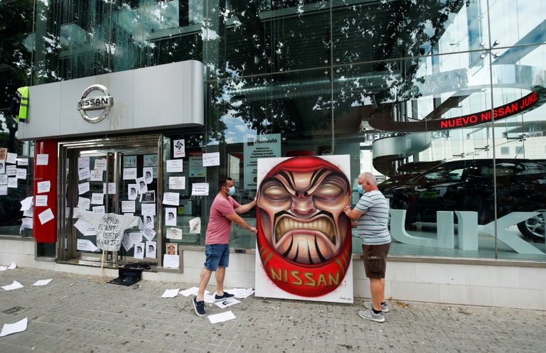 在巴塞隆納日產汽車(Nissan)的經銷展示店外,抗議日產汽車關閉工廠的民眾拿著閉眼不倒翁的塗鴉抗議。