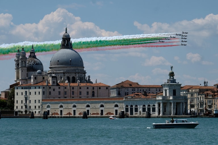 在威尼斯的安康聖母大殿(Basilica of Saint Mary of Health)旁,可以看到義大利國旗色的煙霧,這是義大利空軍三色箭飛行表演隊(Frecce Tricolori)送給民眾、展現防疫期間團結一心的禮物。